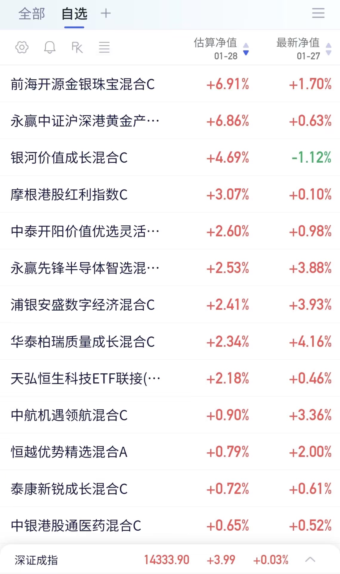以下是部分自选基金当日收益估算(1:40分左右数据):
