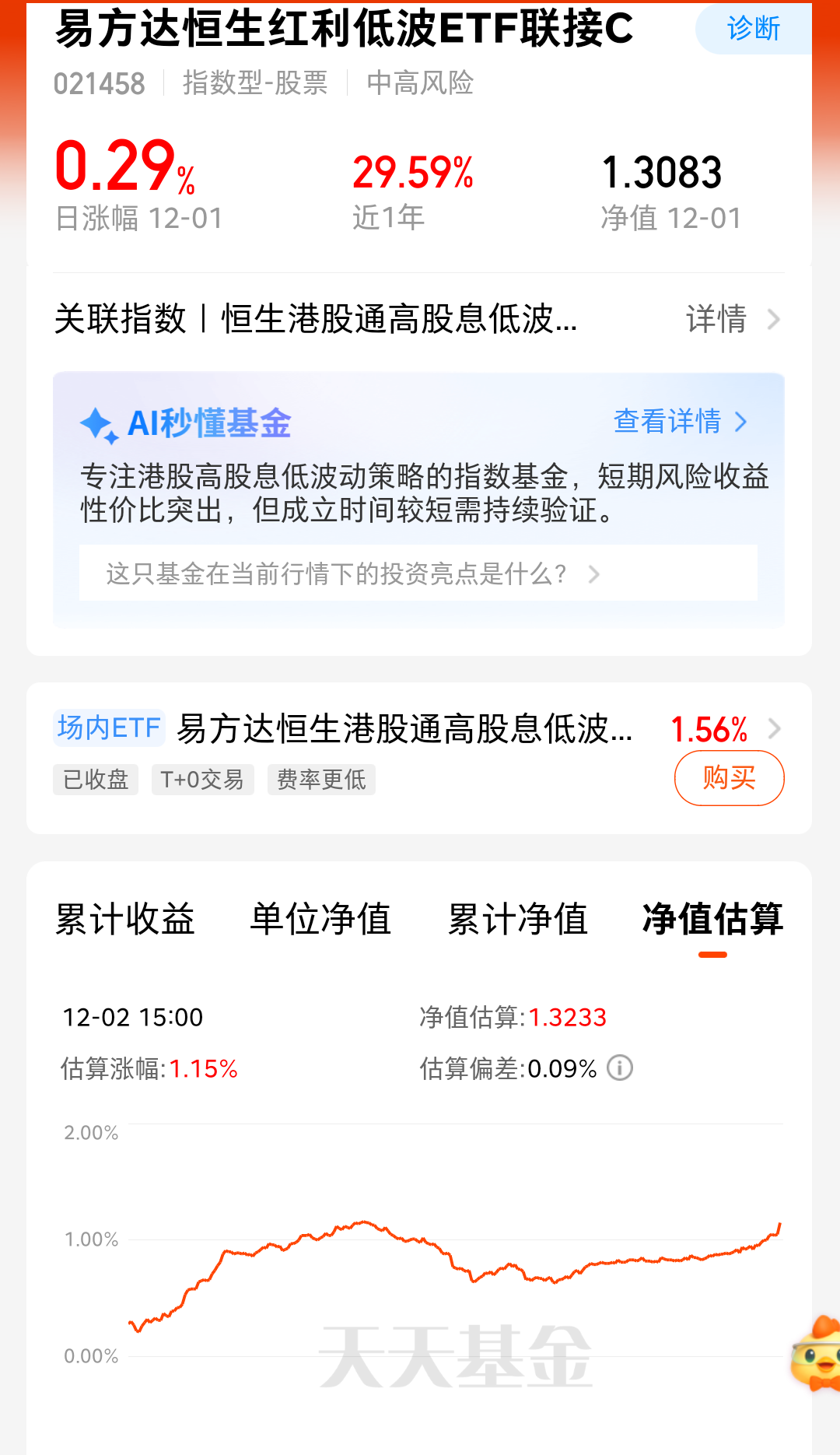 今天股市行情回调,红利赛道红的突出,防御性强。今天恒生红利低波涨超其他红利指数呢。易方达恒生红利低波ETF联接C今天估值上涨1.15%呢。