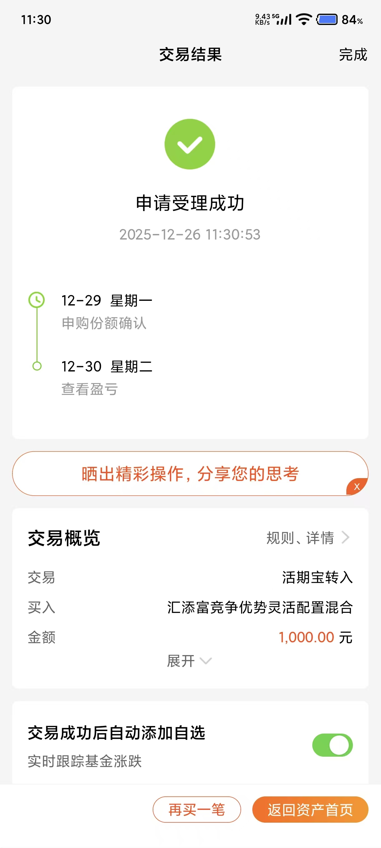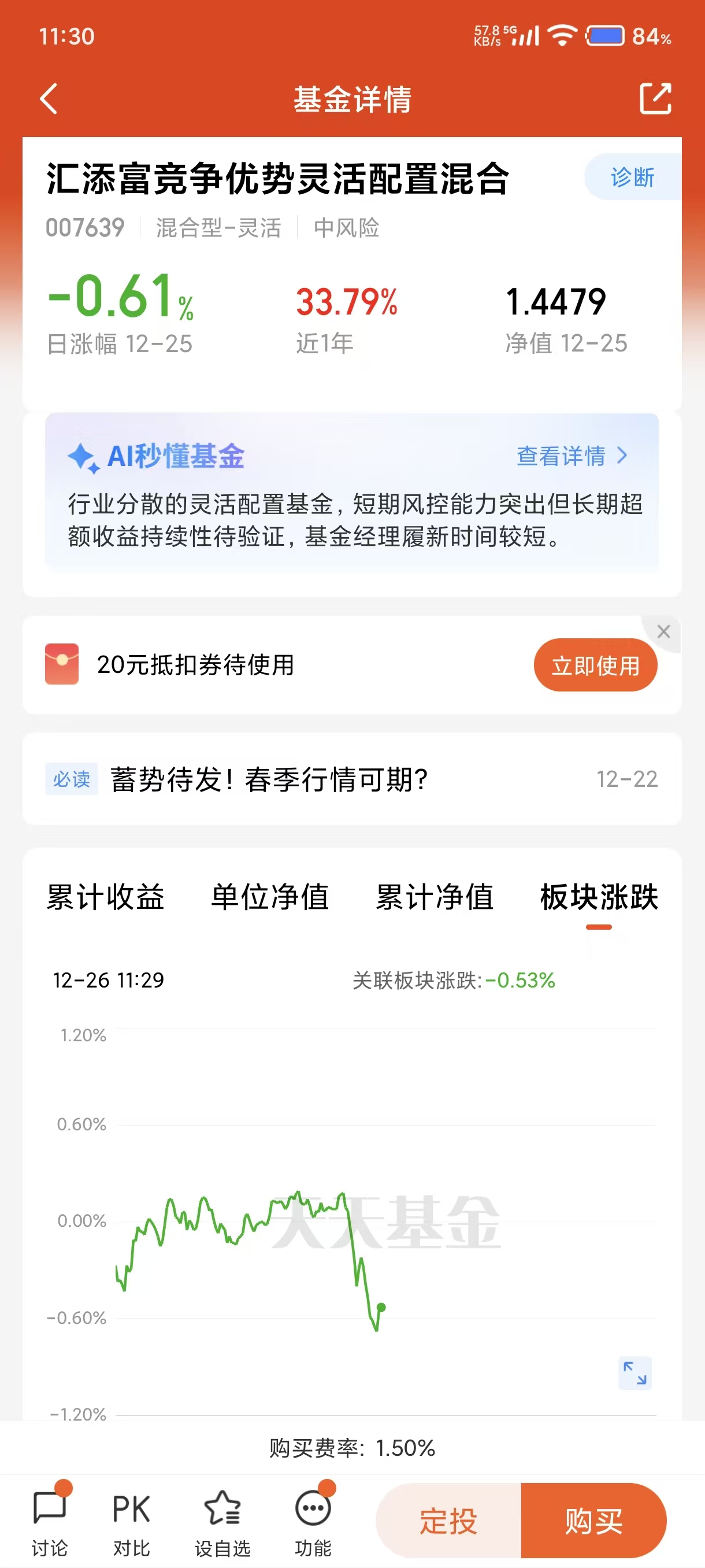 今天我选择加仓1000元汇添富竞争优势灵活配置混合(007639 ),自10月底更换基金经理马磊之后,基金重点聚焦“半导体设备”,把握硬科技自主可控核心主线,投资锐度更强。$汇添富竞争优势灵活配置混合(OTCFUND|007639)$