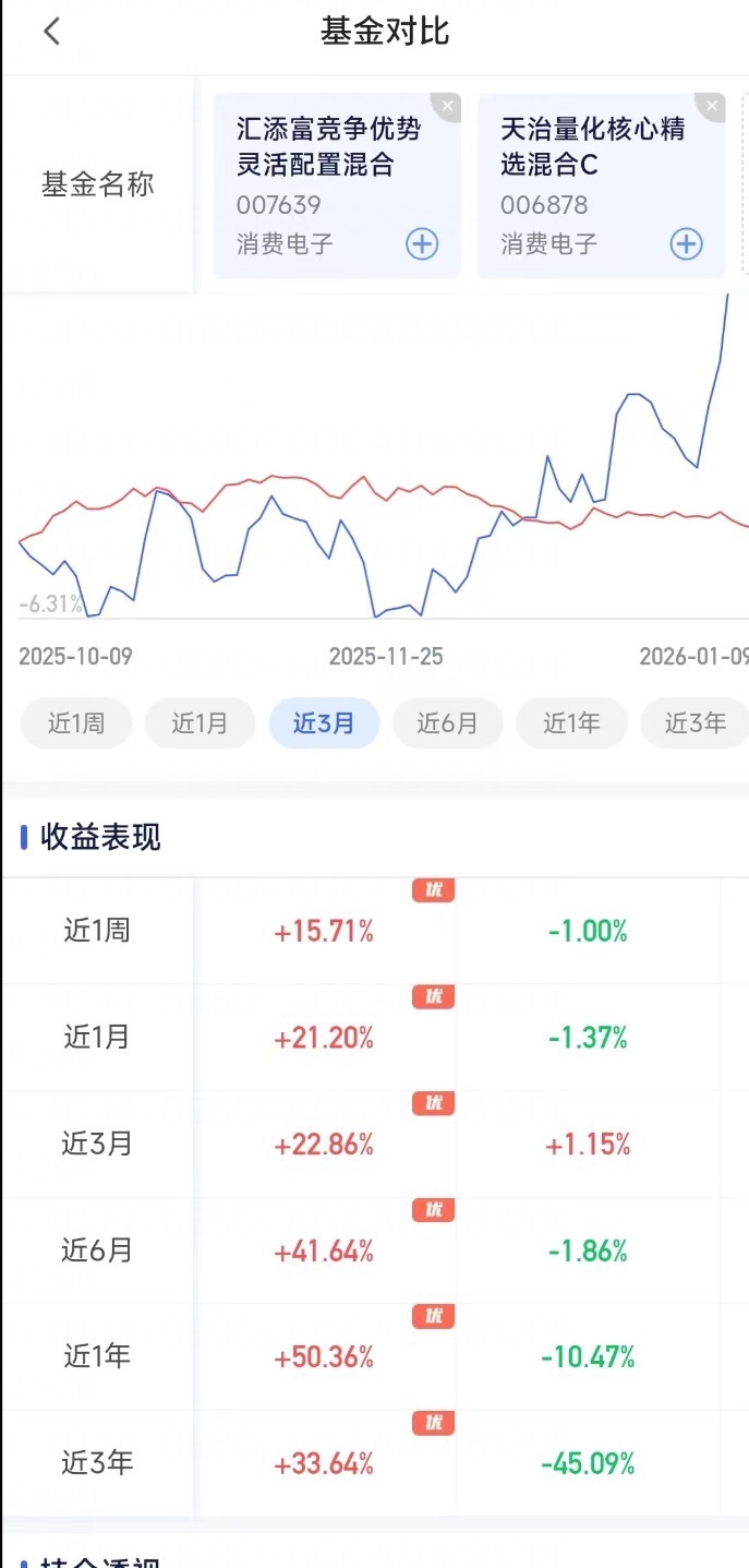 今早市场走得有点分化,沪指深成指小涨,创业板指先跌超1%又拉回来,半导体、Kimi、卫星互联网这些板块直接领涨。$汇添富竞争优势灵活配置混合$ 太顶了,专投半导体设备!去年10月底换了基金经理马磊后,就专攻半导体设备,风格更锐,业绩一路领跑,近3月、近1月、近1周都甩开其他热门半导体基金一大截。 半导体设备板块春季行情早早就启动,都突破去年最高点站上6000点了,这细分赛道质地好、弹性高还能涨更久,机构都抢着买。这基近3月涨22.86%,近一年涨50.36%,近一周直接涨15.71%,近半年上涨41.64%,。添置量化核心精选混合c近一周-1%,近一个月-1.37%,近三个月+1.1%。近6个月-1.86%,近一年-10.47%。对比之下还是会天赋的厉害。现在政策有大基金三期和补贴,AI算力又拉需求,订单要涨超30%,今天市场继续震荡上行,我趁机加仓,中长期看好科技主