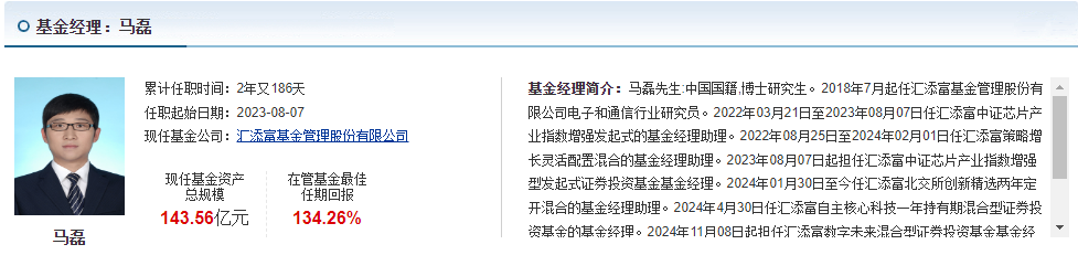 马磊是复旦理学博士,2018年就加入汇添富了,一开始做电子和通信行业研究员,对科技赛道的研究特别深入,后来慢慢转型做基金经理,管过好几只科技类基金,战绩都很亮眼。就拿他管的汇添富北交所创新精选两年定开混合A来说,任职回报高达64.24%,远超同期上证涨幅,能看出他对科技赛道的判断很准,而且操盘风格稳健,不盲目追热点、不重仓赌单一股票。除此之外,他还管过汇添富自主核心科技、汇添富数字未来等基金,都是聚焦科技领域,深耕多年的经验。