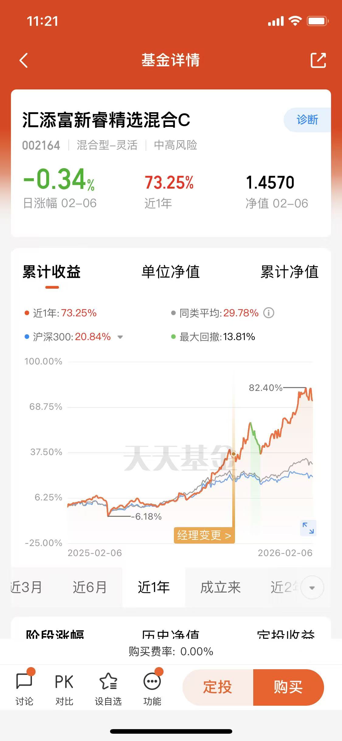 另外管理费率也低,市面上不少的同类科技主题混合基金的综合费率在2%以上,这只基金的运作费率才1.40%。低费率长期持有下来,能省不少钱,比如投1万块,一年就能比高费率基金多赚几十上百块,积少成多也是一笔收益。