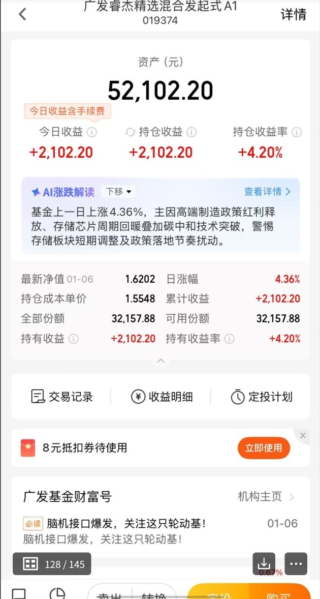 说实话,像脑机接口,航空航天这种领域,突然大涨,个人很难研究透。广发睿杰我买了今