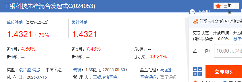 成立时间新:2025.7.18 成立,持仓完全契合当前科技行情