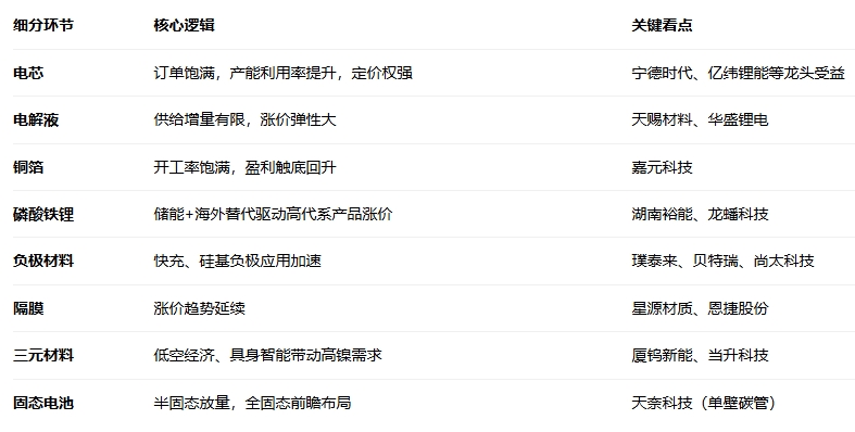 总结来看,锂电行业2026年将迎来储能需求驱动的新周期,电芯环节龙头优势凸显,材料环节需把握涨价节奏,同时需密切关注固态电池技术产业化进程带来的颠覆性机会。
