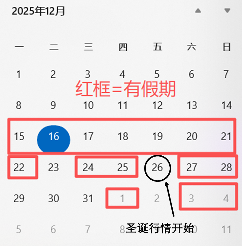 12月26日(周五):Santa Rally,圣诞行情的官方定义窗口期通常从这一天开始(每年的最后5个交易日+新年的前2个交易日)。历史上这段时间美股大概率上涨。如果这段时间反而跌了,通常预示着明年一季度行情不好。