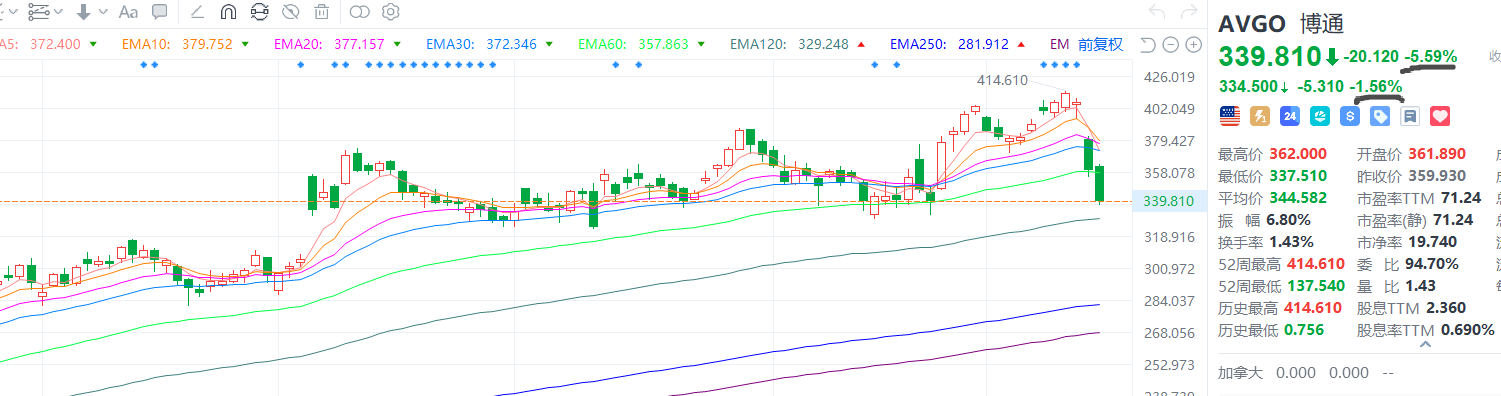 博通昨天跌的比较多(-5.6%),走势位置比较高所以回调的更多一些,不过也砸回到前低了。盘后又跌了-1.57%,看今天开盘能不能往回收,不至于一口气跌下去。