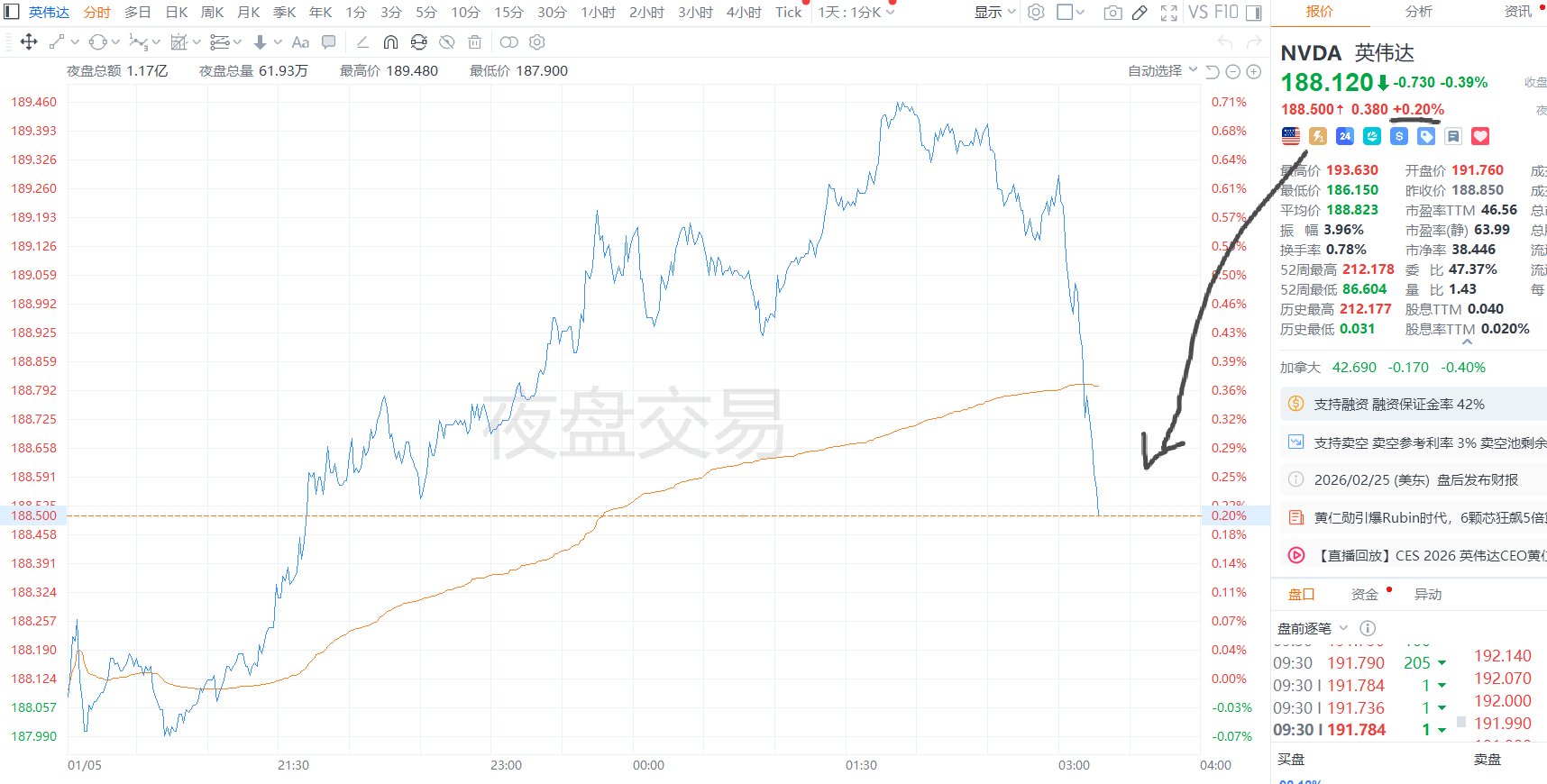 英伟达美股盘中没涨,盘后的夜盘涨的也不多,临近盘前还跳水了。