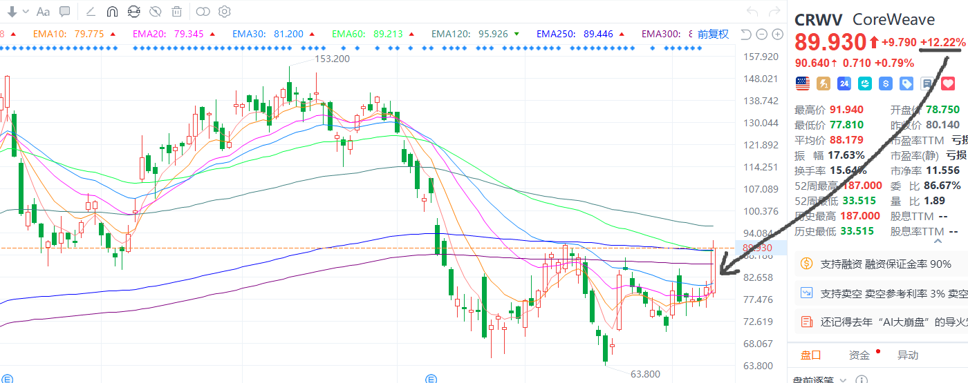 另外,昨晚另一个饱受AI融资质疑的新云CoreWeave也大涨了+12%。