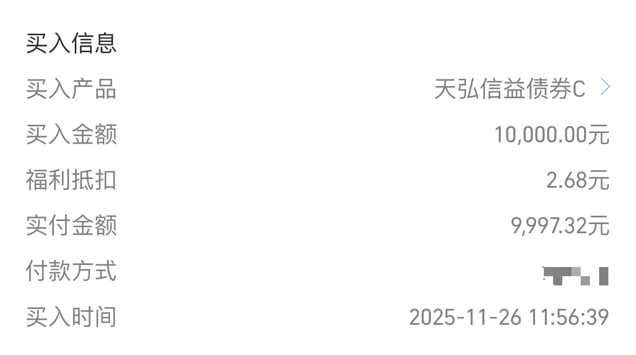 $天弘信益债券C$ 加1w。债市经过了一轮阶段性调整,根据这段时间的表现来看,已经开始逐渐稳定了,近期权益市场的波动也有所加剧,所以我准备陆续加一些纯债回来作为防守,今天我加仓天弘信益债券C,这也算是我的老朋友了,它是一支中长期纯债基金,持仓以65.13%的信用债为主,叠加了18.51%的利率债辅助,通过波段操作增厚收益,提升组合的流动性。它的持仓不含股和可转债,近一年收了304个蛋,比起短债来说,它的收益空间相对较大一些,回撤也比较温和,整体走势较为平稳,我在讨论区领到了一个菜包,今天我先加仓10000元。