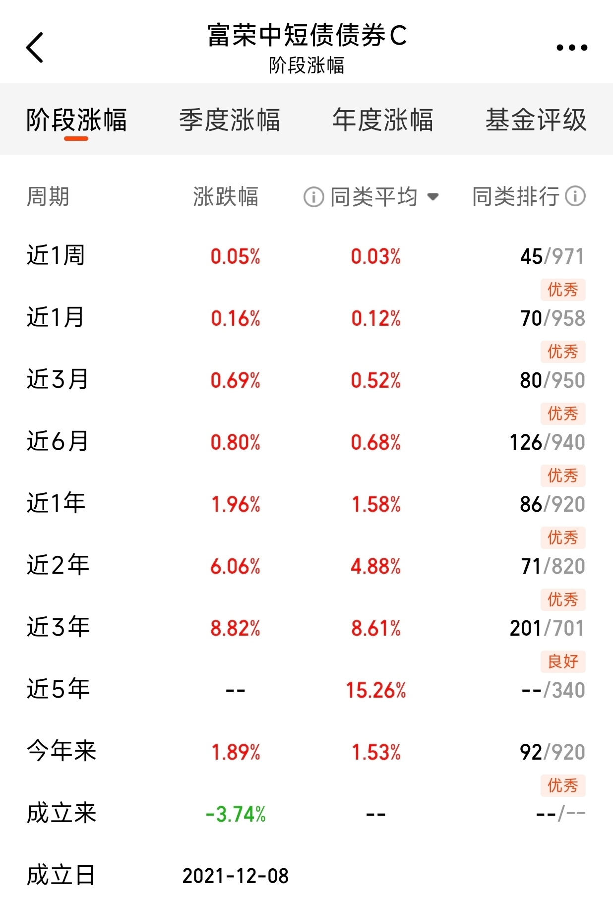 马上假期,确实不值当配置其他了。$富荣中短债债券C$ 入手还是很不错的,今天没丢蛋