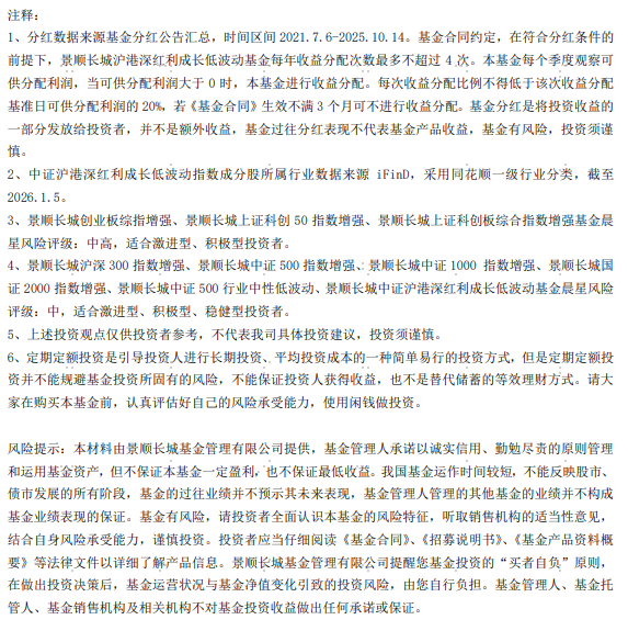 风险适配前提下,欢迎继续关注红利,$景顺长城沪港深红利成长低波指数A(OTCFUND|007751)$、$景顺长城沪港深红利成长低波指数C(OTCFUND|007760)$、$景顺长城沪港深红利成长低波指数E(OTCFUND|021735)$,已经连续18个季度分红【注1】,跟踪指数覆盖A股+港股两地优质红利股,成分股前三大行业分布为银行(35.16)、通信(3.91%)、医药(11.67%)【注2】,分散投资市场,还将成长纳入选股指标,兼顾成长进攻特性。风险适配前提下,欢迎关注。