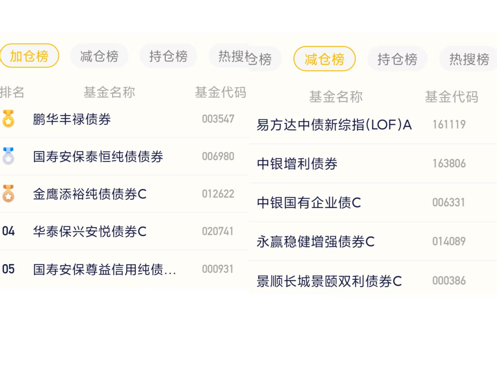 七、债券基金加减仓榜单