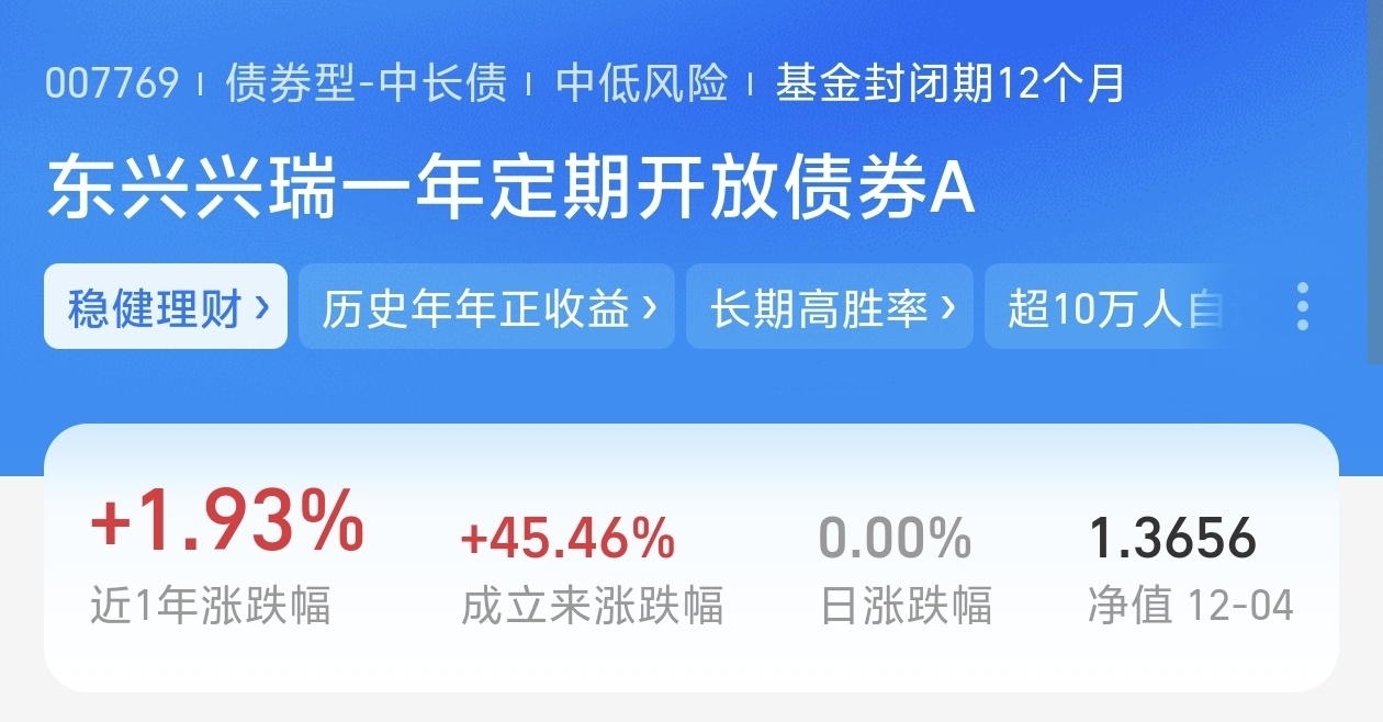 开放申购了,我这波正好趁着这个机会上车一下,本来也是封闭类的,让人安心一点,看表现也是偏向于长期的吧,近一年也是193个蛋,我这波先来点,看看后续的一个收益了$东兴兴瑞一年定期开放债券A$