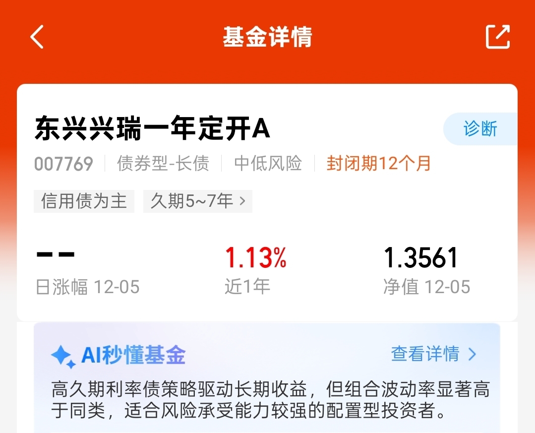 看好下周债市反弹,定开基金省事,免得频繁买卖,东兴兴瑞一年定开,近一年正收益超1%,低回撤,看着可以。