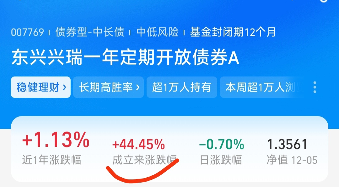 今日权益市场升温,债市波动,$东兴兴瑞一年定开A$近一年净值涨了1.13%。它专
