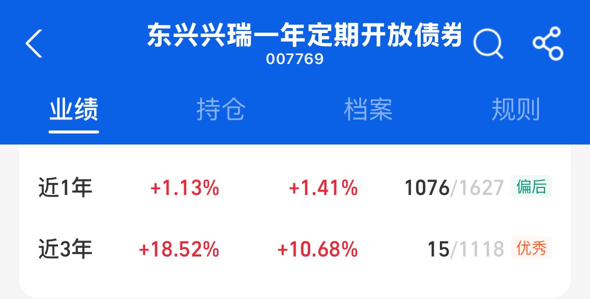 今天债市情绪偏谨慎,利率债震荡下跌,信用债多数下行,市场结构化特征显著。$东兴兴瑞一年定开A$ 近一年收蛋 113 个,不投股票及可转债,远离股市波动,持仓兼顾高流动性与收益性,重仓优质信用债及少量特别国债,基金经理预判能力突出,历次债市调整中均有效控回撤,年化收益达9.03%,今天开始开放了哦!