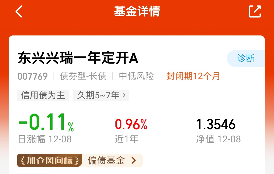 $东兴兴瑞一年定开A$ 这只基,在近期债市调整里确实算稳的。它主投高等级信用债,比如国企债等,底子就比较扎实。基金经理在杠杆和久期上控得比较紧,没去博短期弹性,所以回撤明显比同类小。每天有的票息收益持续积累,对冲了部分波动,拿着心里比较踏实,感觉还挺不错。