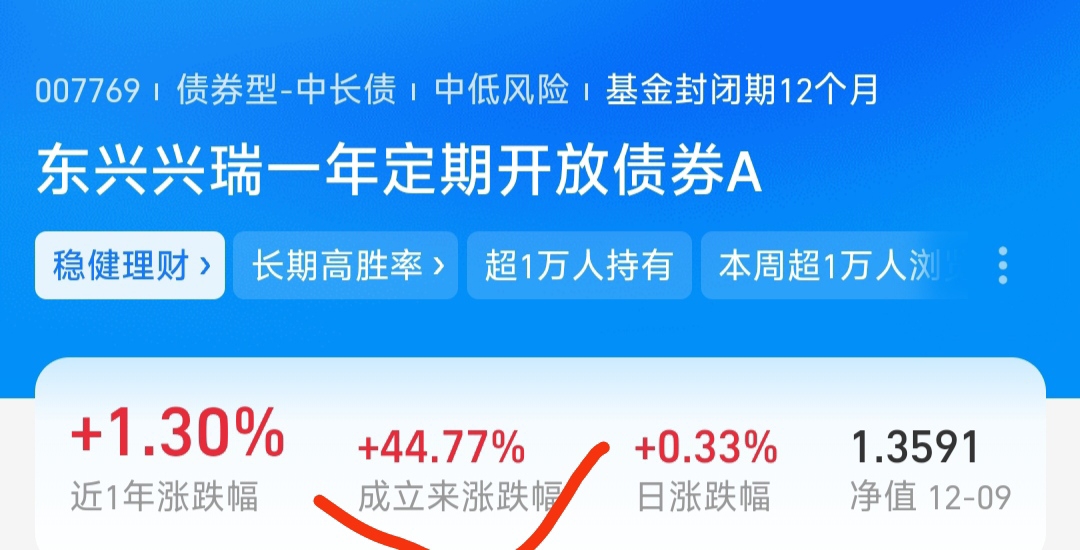 权益走低,债市回暖。$东兴兴瑞一年定开A$ 昨天单日收获33个蛋,今天也是预估收蛋,近一年的收益率高达1.3%,就喜欢一年期的定开基,不会锁太久,流动性和收益性都不错。$鹏华永融一年定期开放债券$ $广发民丰一年定期开放债券$