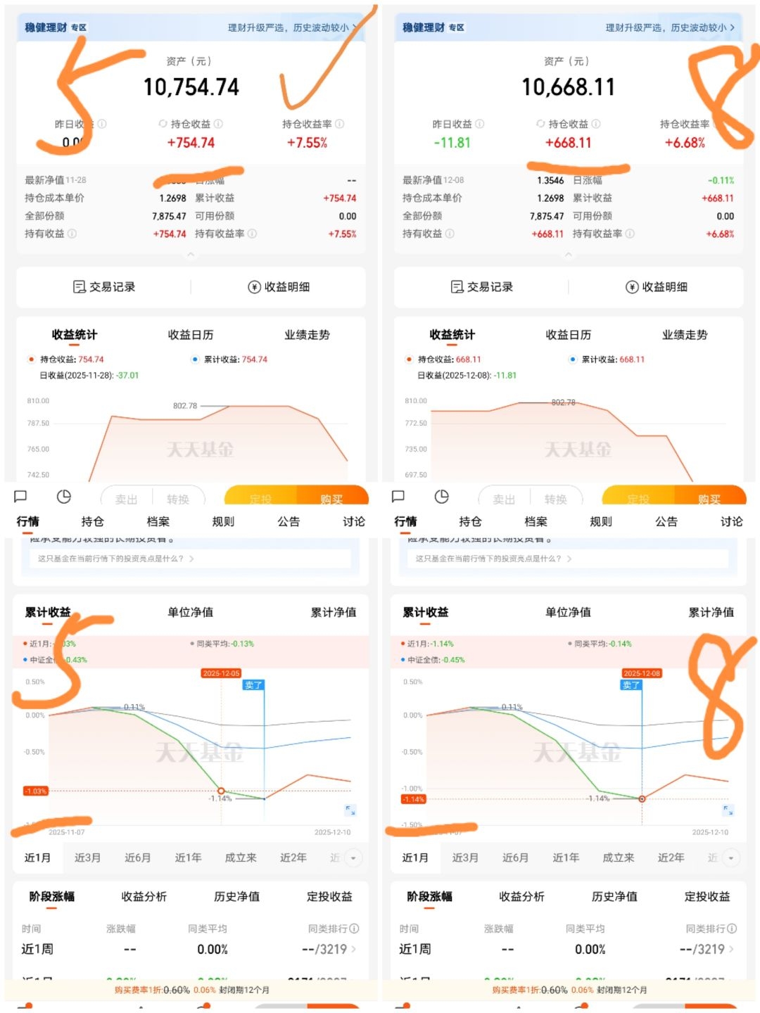 我已举报到证监会:12/5我收益754.74元,12/8赎回只剩668.11元;12/5该基金本月下跌1.03%,到12/8下跌1.14%,也就是说这期间下跌了0.11%乘以持仓10754.74,应只少收益11.83元,硬生生的少了74.80元,占收益的10%。可恶不可恶?