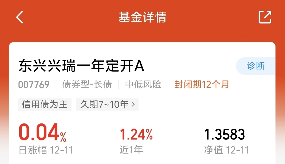 昨天债市太给面儿啦!利率债、信用债都往上走,$东兴兴瑞一年定开A$ 昨天直接赚了4个蛋,近一年更是攒了124个蛋,长期收益也可以。现在能申购了,而且中长债行情也慢慢好起来了,我打算入手试试!