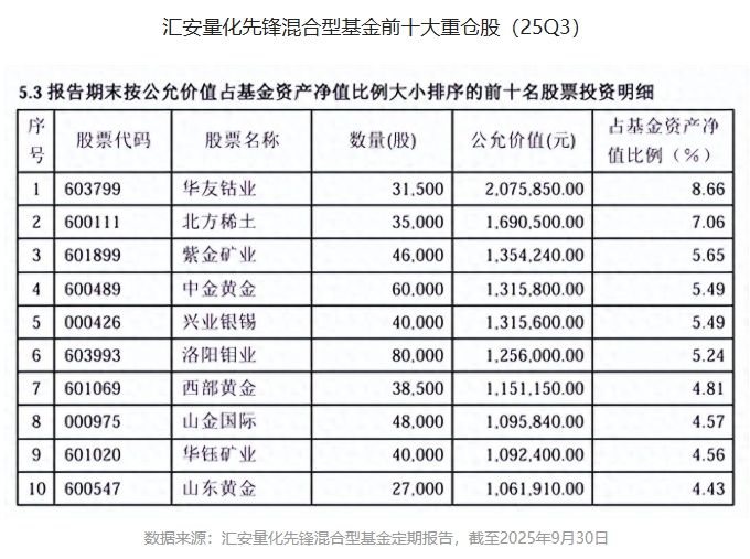 杨坤河管理的汇安量化先锋混合型基金,目前重点关注黄金和上游资源品。从2025年三季报看,该基金前十大重仓股清一色为有色金属领域的龙头公司。若按申万二级行业划分,前十大重仓股中有5只为黄金股,3只为稀有金属股,2只为工业金属股。Wind数据统计,截至2025年12月3日,汇安量化先锋混合A今年来收益率为53.10%,位居同类前10%左右(具体排名为456/4469,同类为偏股混合型基金)。