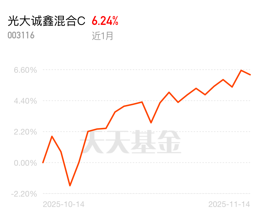 身边不少人吐槽市场横盘调整赚不到钱,其实是没选对产品,光大诚鑫混合C近1个月涨6