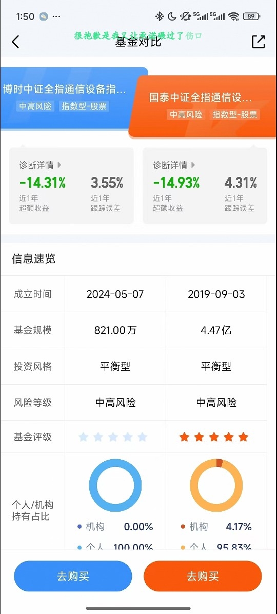 $博时中证全指通信设备指数发起式C$ 跟踪误差才3.55%,比国泰的4.31%准,行情一点不跑偏。
