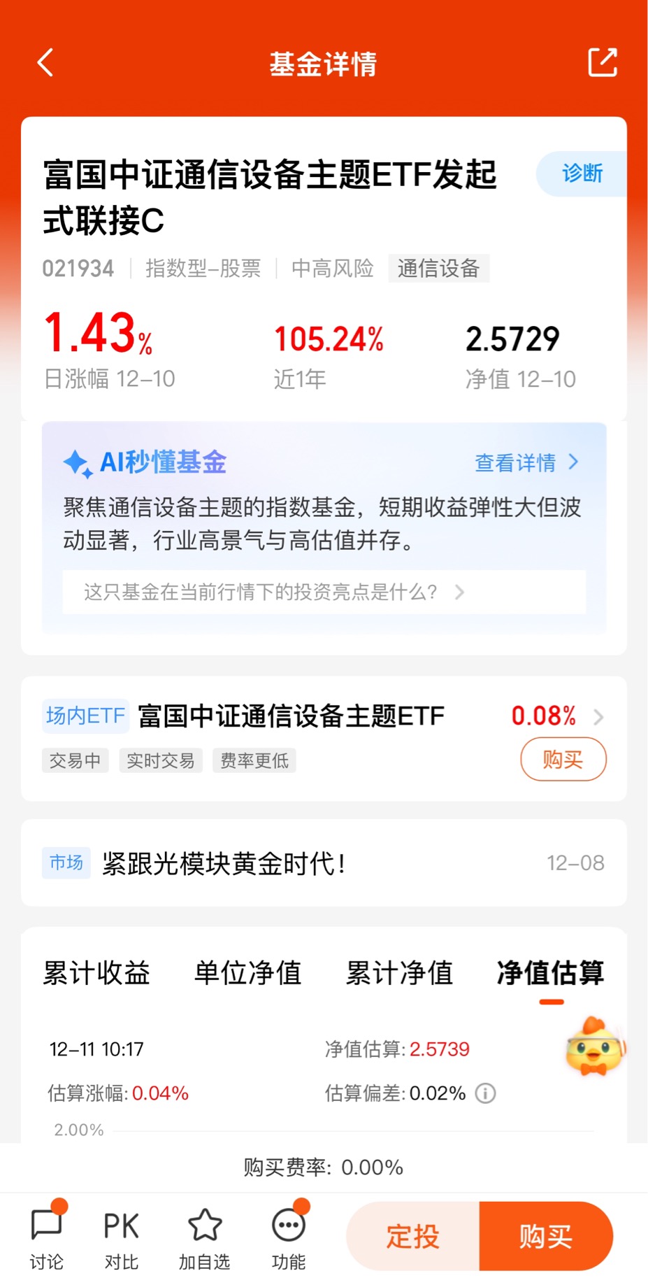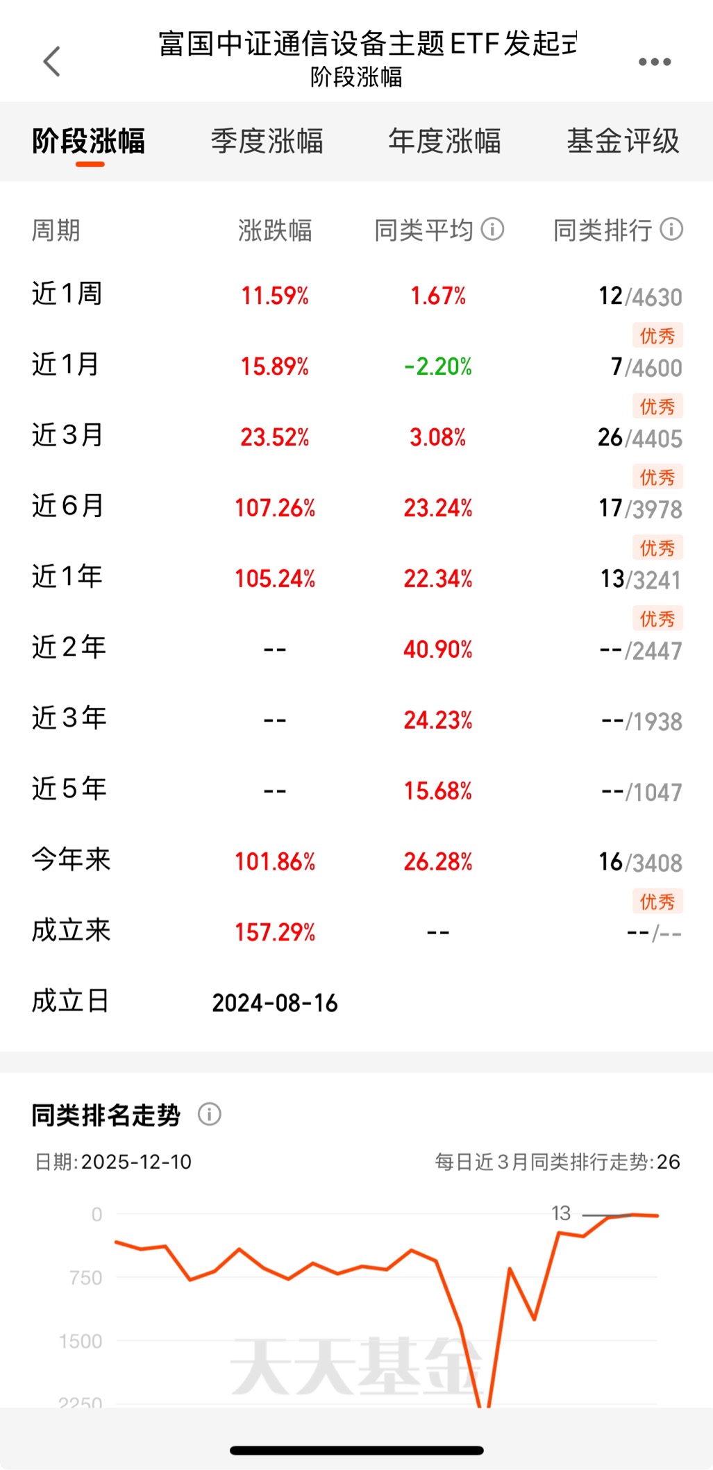 $富国中证通信设备主题ETF发起式联接C$ 昨天上涨1.43%,比$国泰中证全指通信设备ETF联接C$ 上涨超0.7%,不管是短期还是长期,都能跑赢业绩基准,近一周、近三月的涨幅都很亮眼,表现太能打了