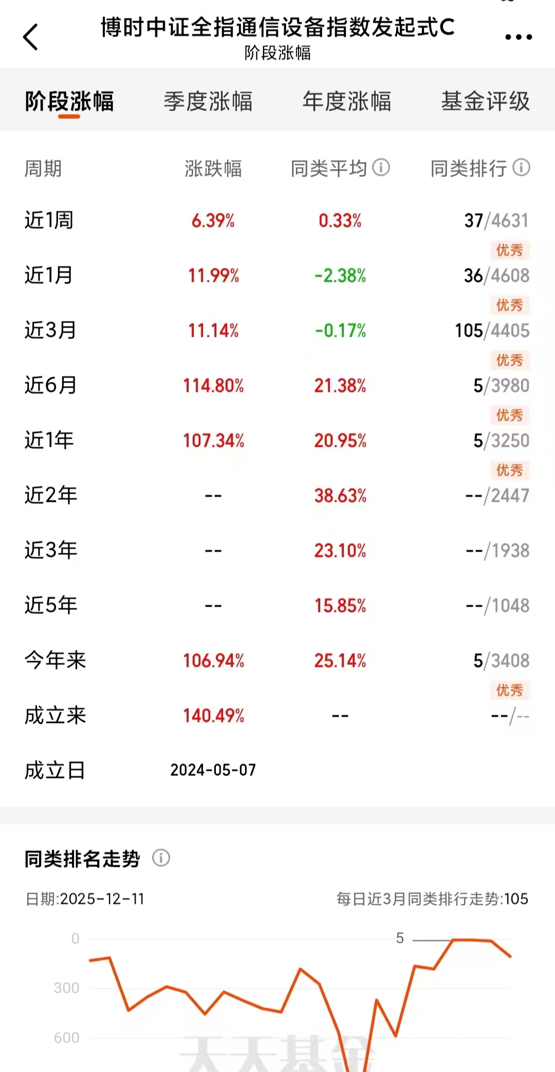 $博时中证全指通信设备指数发起式联接C$在同类里一直是“稳狠选手”,不管是近1个月的短期行情,还是近1年的长期表现,都牢牢卡在第一梯队,表现太能打了