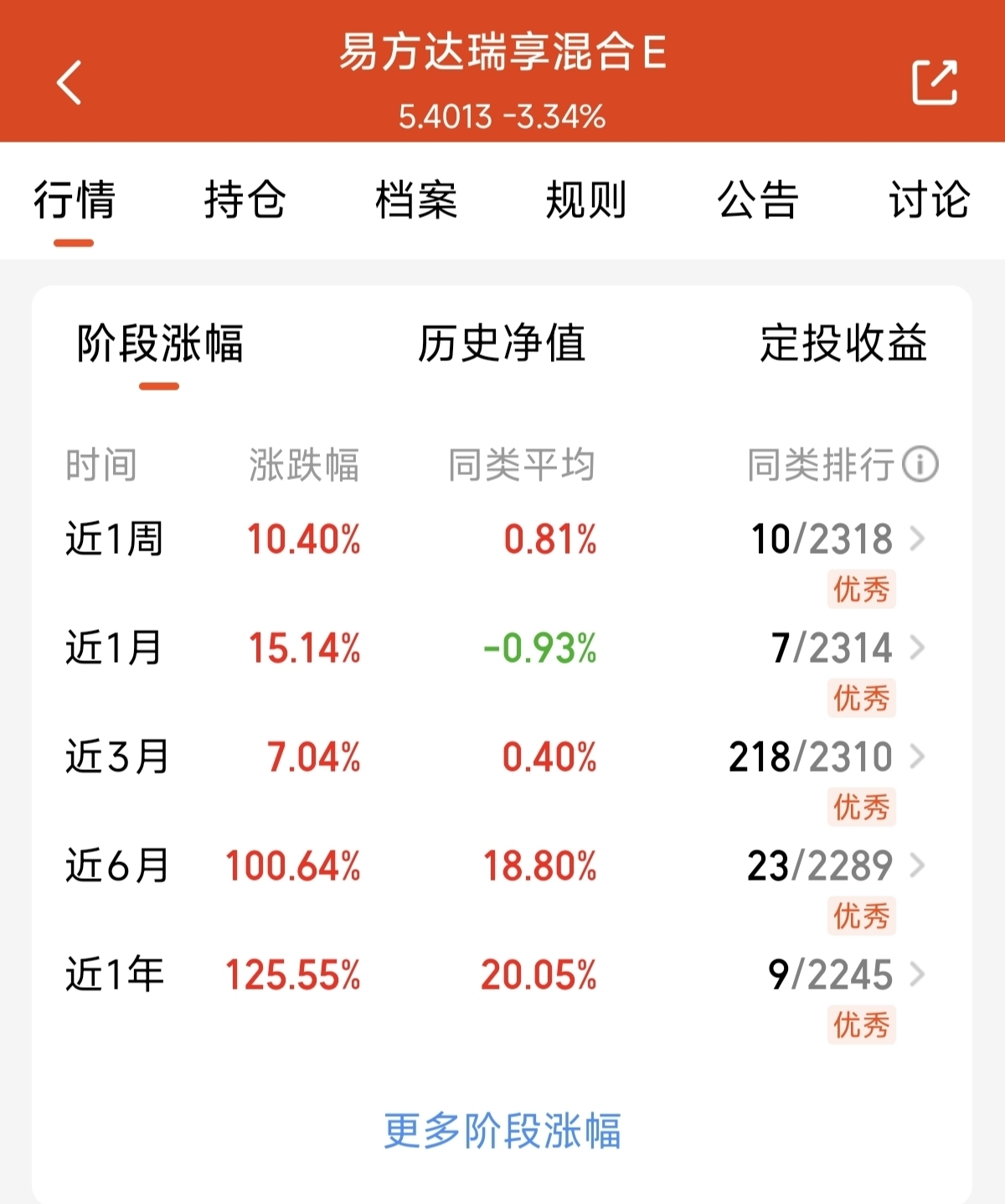 $易方达瑞享混合E$ 这只主动科技基金,聚焦科技成长赛道,重仓CPO光模块,以及国产算力产业链,长期业绩稳定性好,近半年涨幅100.64%,近一年涨幅125.55%,是同类人平均业绩五倍还多,成立来已经涨超400%,我看好长期的稳定收益表现,期待继续创新高!