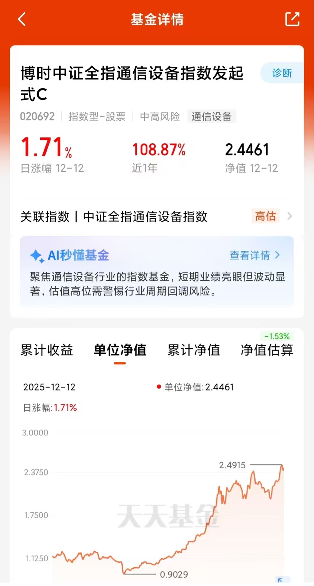 $博时中证全指通信设备指数发起式C$跟踪准,近一年涨108.87%,在同类基金里