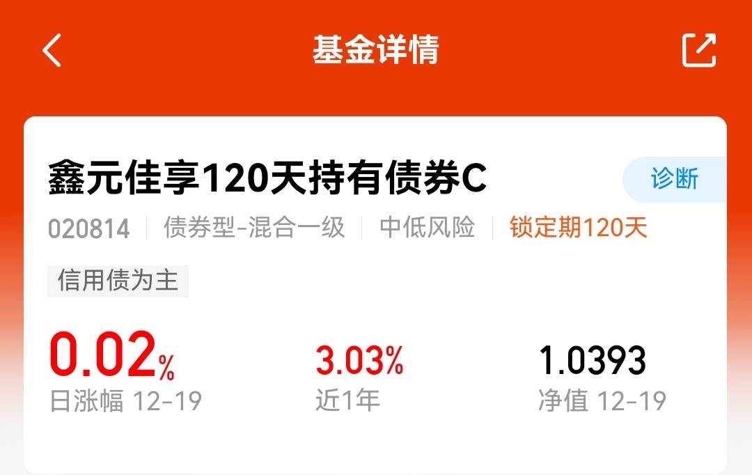 低波动理财怎么选?$鑫元佳享120天持有债券C$ 给你答案!近期走势平稳向上,中低风险属性加持,稳稳接住你的理财需求~