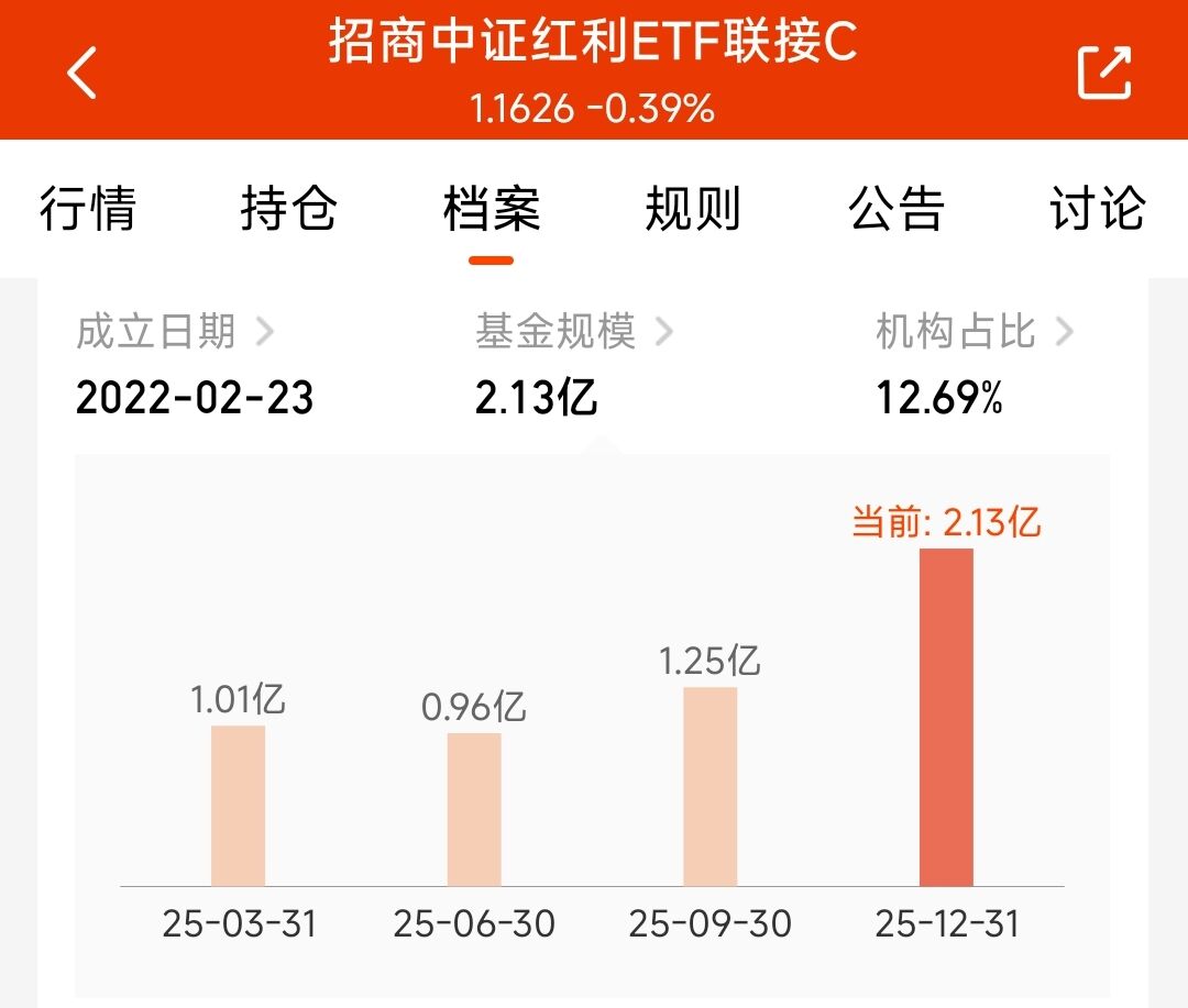 节前市场磨心态,别被涨跌带节奏,不追涨不杀跌,守好仓位保住本金,就是最稳的操作。$招商中证红利ETF联接C(OTCFUND|012644)$ 聚焦高分红、低估值个股,主打红利低波动,兼顾稳健股息与长期收益,完美适配节前防守需求,拿住就是安心。
