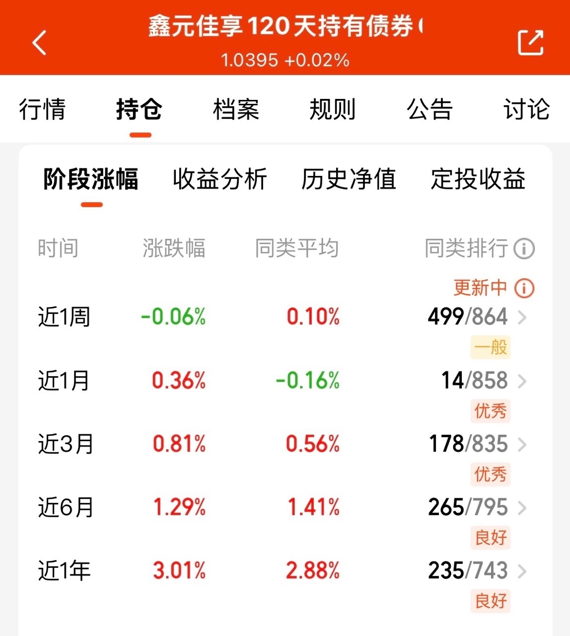 鑫元佳享120天C$鑫元佳享120天持有债券C$ 太靠谱!近一个月稳稳涨了0.36%,不用担大风险,过往业绩一直亮眼又稳健。