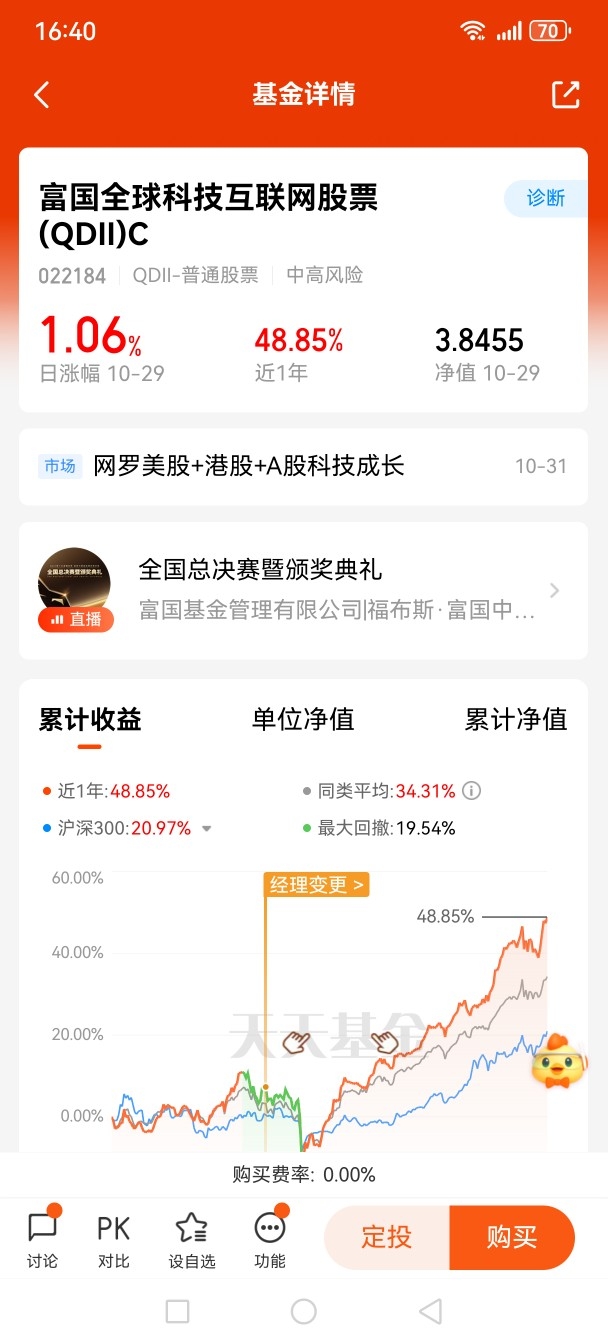 我油(华宝标普油气C)拿得好好的,顺手配了点富国全球科技互联网C它主投全球科技成长,稀缺!最近调仓更偏美股科技股,纳指和同类都限购了,它还有额度,近6个月涨了48%,跑赢一片。