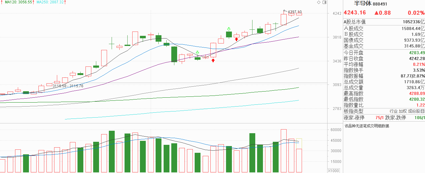 家人们,咱们今天得把目光聚焦到那个让人又爱又恨的半导体!昨天昨天窄幅震荡,今天也是窄幅震荡,但周三半导体是大阳反弹创新高,连续两天横盘我觉得是异常现象,按弱势板块比如消费方向看,只要出现小阳线次日就是小阴线反包,半导体在连续上涨后居然能达到多空平衡,自然就是资金继续流入的表现。此外,半导体本次上行是沿着5天线的,周一、周三连续两天大阳反弹,已经远离了5天线,借着周四和今天的震荡,半导体的5天线继续上移,如果没有猜错的话,下周一半导体的5天线会继续上移,对半导体形成支撑。还是原来的观点,回踩5天线不一定是回调来实现的,有可能就是拉高后横向震荡,即使市场选择了强势表现,在上升趋势中尊重市场很重要,只要没有看到有力度的资金流出,我依然会继续看好半导体板块。
