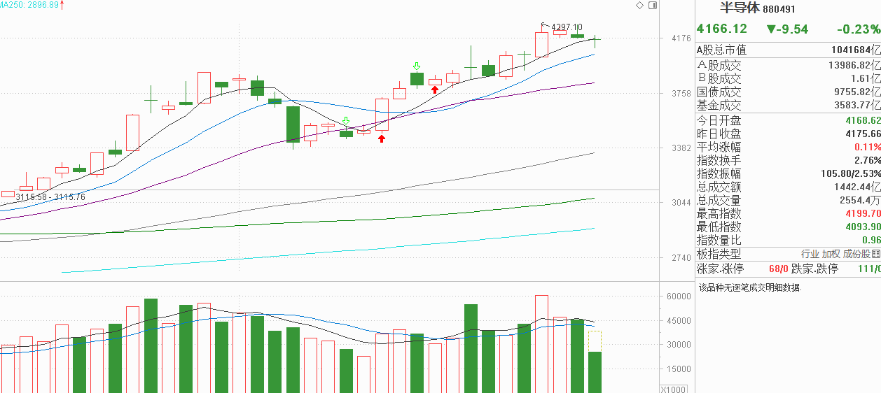 家人们,咱们的目光必须锁定半导体!上周五冲高回落窄幅震荡,今天低开低走后探底回升,下影线对标上周五的上影线,说明多空已是平衡,当下半导体刚好回到5天线并获得支撑,我觉得短期获利抛压基本释放了,毕竟长假期间市场有不确定性,一些厌恶风险的资金会在这种情况先止盈离开,在节后消息消化后再重新流入。从中线走势看,半导体自9月11号大阳线反弹后震荡上行,穿过8月28号大阳线高点时并没有出现有力度的中阴调整,筹码的稳定度是很好的,市场重心继续上行,5天线继续上行,我觉得半导体还有继续走高的可能。当然,节前只剩下两个交易日了,主力在节前重启涨势的概率并不大,还是安安静静的守住5天线,等待节后市场的变化吧,无论半导体如何转变,当下连5天线也没有失守,看淡是没有必要的,真能回踩10天线,我觉得反而是倒车接人的机会。