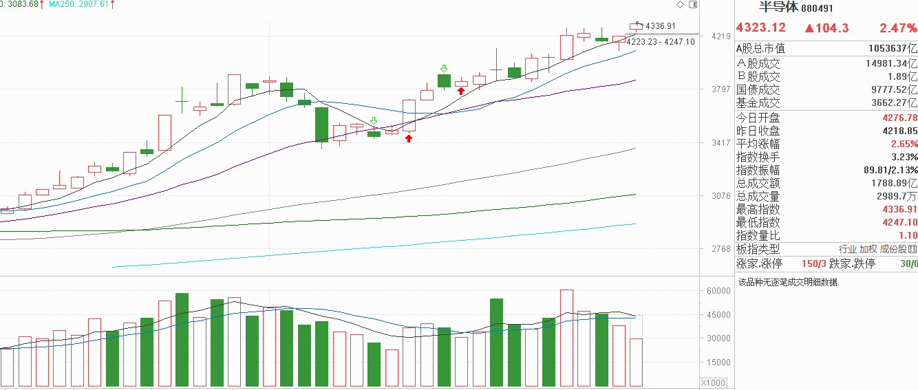 家人们,注意了!半导体昨天怎么着?探底回升还在5天线上方,下影线并未回踩10天线,感觉承接力比预期要强。今天高开后又是探底5天线后回升,日内就完成洗盘,5天线连续两天都回踩了,感觉趋势都很稳,市场资金还在往这个方向流入,要等待半导体出现像样的回调我认为有点难,毕竟只有散户适应市场,没有市场适应散户,节奏把握不好只能顺势而为,资金在流入就看涨,资金有流出就谨慎。本次半导体上涨走得太稳了,突破8月28号大阳线后是以横盘替代调整,还在等回落到9月初的价格我觉得很难实现。当下半导体更像机构风格控盘,只要5天线继续上移,顺势而为可能是最好的策略,当然,每一次回调至支撑位还是要努力把握的。