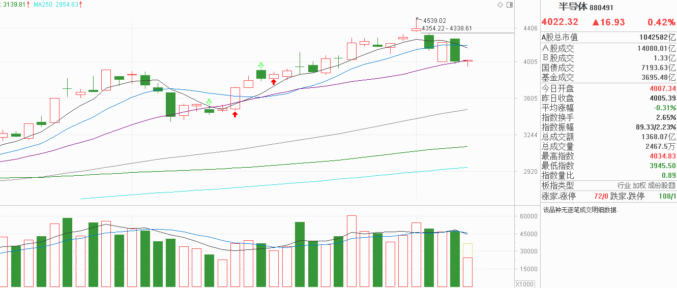 家人们,今天必须给大家聊聊那个让人又爱又恨的半导体!昨天高开低走中阴调整把周一假阳线反包了,感觉抛压依然很大,但并没有失守20天线,今天半导体围绕20天线做窄幅震荡,算是9号冲高回落后连续三天调整的一次休整,目前并没有看出多头抵抗的信号。从中期走势看,半导体自突破8月25号高点后震荡上行,并没有明显的单边急涨,这一次回调感觉洗盘很是彻底,加上今天成交量明显萎缩,我认为短期急跌调整已经进入尾声,只要市场情绪回暖,出现企稳信号是比较容易的。问题是现在只属于多空平衡,啥时候有资金流入是说不清的,没有资金参与那怕有反弹,波动幅度也不大。所以现在最好的情况是等待主力资金流入,什么时候主力资金流入,什么时候就看好半导体的反弹行情。