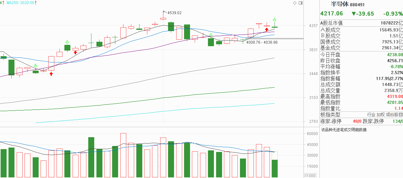 我的天呐!老铁们!看看半导体昨天那表现!低开后冲高回落出现上影线,由于周一是高开探底回升是带下影线的,我认为上影线是阻力的表现,下影线是承接的基础,半导体在当前位置下就是多空平衡。今天受英伟达再创历史新高影响,整个人工智能板块都有明显的利好刺激,半导体一度也是中阳反弹,但现在却是冲高回落,再次出现上影线,说明抛压开始加大了。不过半导体上周五中阳反弹后下方均线都在拐头向上,昨天5天线还上穿20天线形成新支撑,真出现回调,5天线、10天线都是支撑,下行空间估计并不大,但要再次出现下影线探底回升才能确认新的承接区在那里。从中线看,当下半导体运行在10月9号上影线与8月28号大阳线的大箱体内,现在刚刚就在中位区,向上可以向下也有概率,感觉就差主力进一步表态了。对于科技板块,在人工智能的加持下我认为中线是可以期待的,但短期发现阻力就得先消化,消化完了再重启涨势也是不错的。