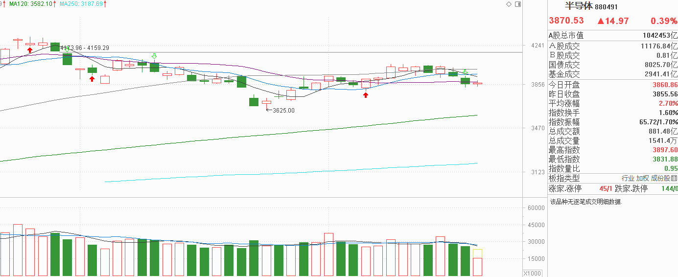 半导体昨天小阴调整回踩20天线,刚好回到12月3号的低点,算是完成了一次轮回。今天在20天线附近窄幅震荡,实际上就是存量博弈的信号,毕竟12月半导体基本围绕60天线做震荡,没有多少获利筹码,经过这两天的回调,一切又回到原点。上一次在这个位置有支撑,本次也一样。关键是当下正是市场冰点状态,抛压基本已经枯竭,如果没有更大的市场抛压,我认为半导体当下已经过到一个平衡状态,继续向下的概率与反弹概率基本相同。当然,如果市场出现回暖资金重新流入打破这个平衡,半导体重新走强也是大概率的事情,因为当下科技题材的影响度非常高,如果离开科技,实在也找不到其它高景气或潜在的高景气方向。换句话说,如果市场回暖不带半导体,这种回暖是假回暖,如果市场继续冰点波动,半导体或许还是继续打酱油,反正已经横盘了三个月,也不差这两周时间了。