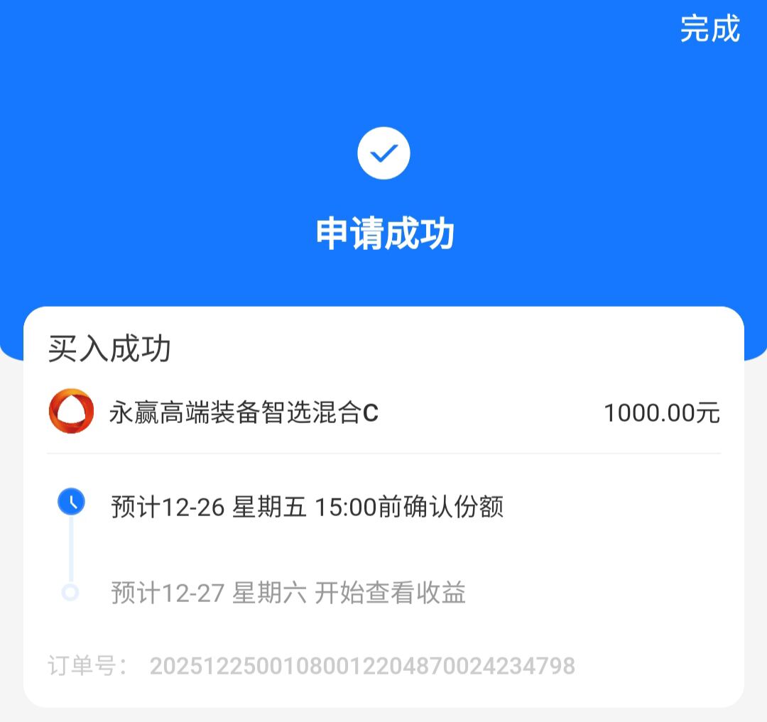 今日买入1000元$永赢高端装备智选混合发起C(OTCFUND|015790)$,该基金聚焦卫星互联网、商业航天,弹性比较大,在昨天这个方向领涨两市,而该基金净值涨幅高达7.17%,是昨天涨幅榜榜一大哥,我在之前持续布局,最近也赚了不少,持有收益率上涨至36.26%,我还是比较满意的,今天还在继续上涨,继续带来惊喜。