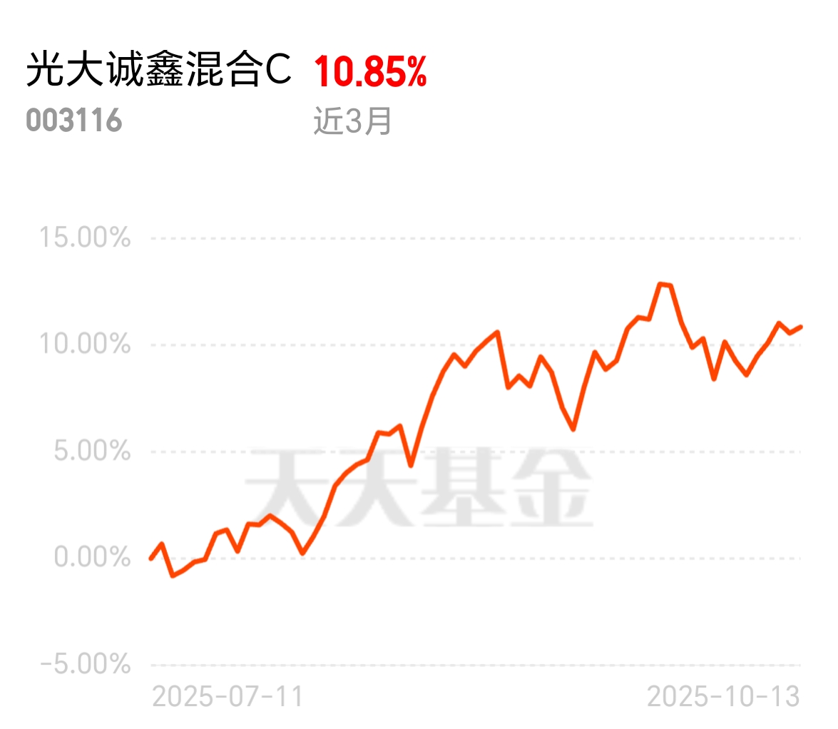 最近行情慢慢往上走,之前持仓的都开始赚了。光大诚鑫混合C近3个月业绩10.85%