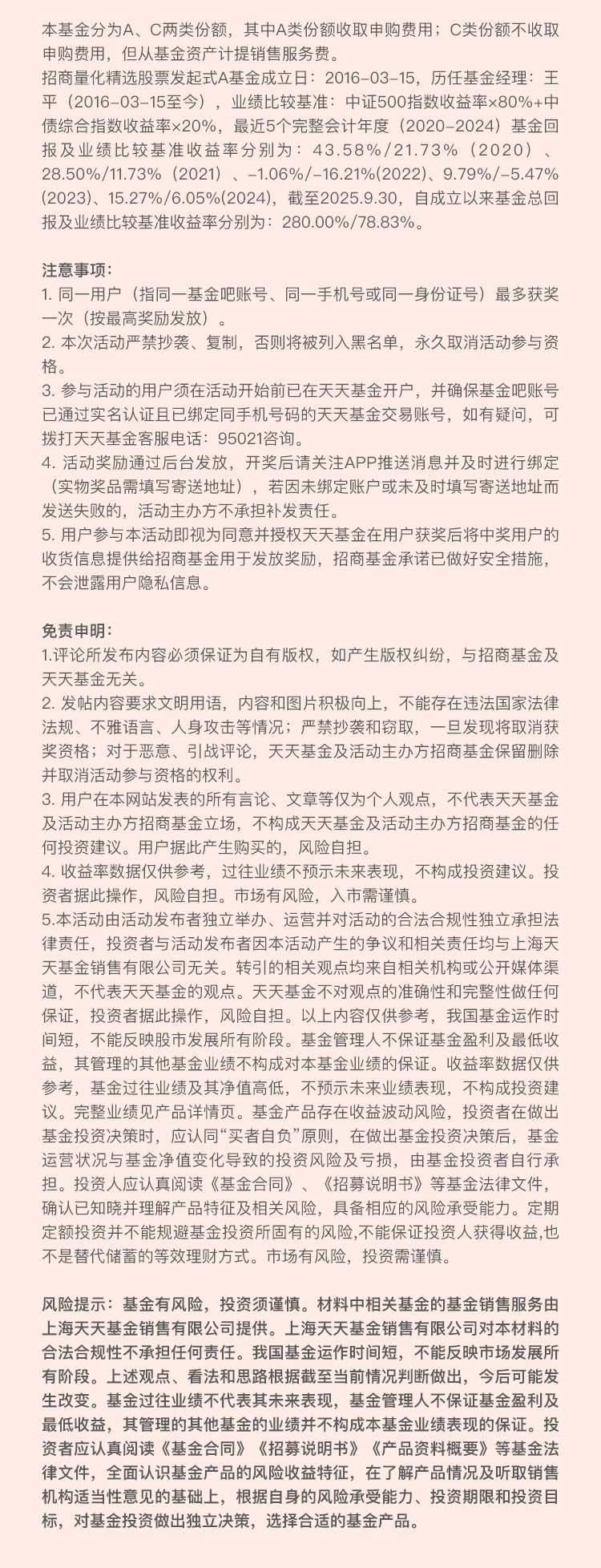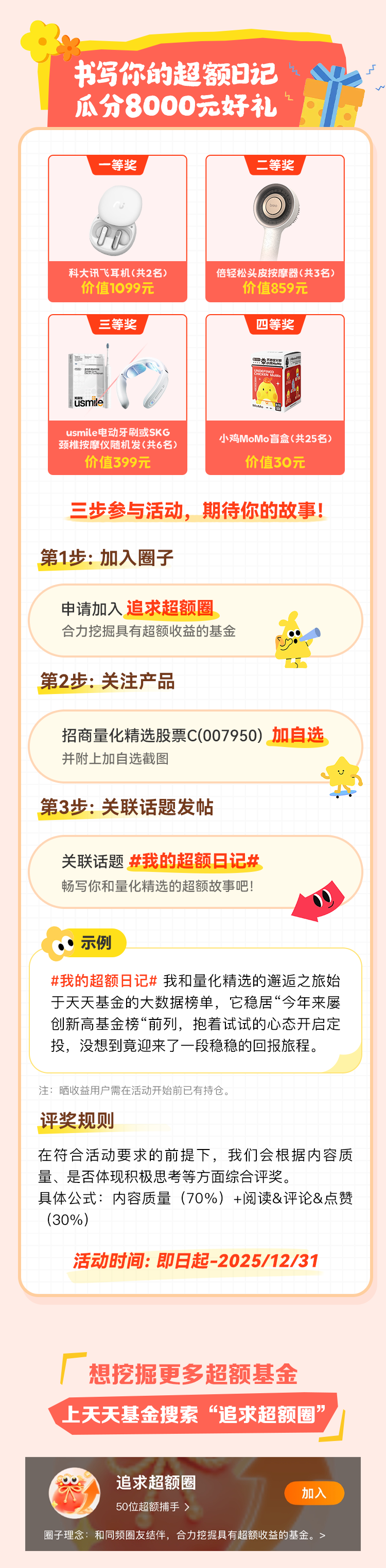 【发帖格式】 将招商量化精选股票C(007950)加自选,关联话题 #我的超额日记#,并附上加自选截图发帖。