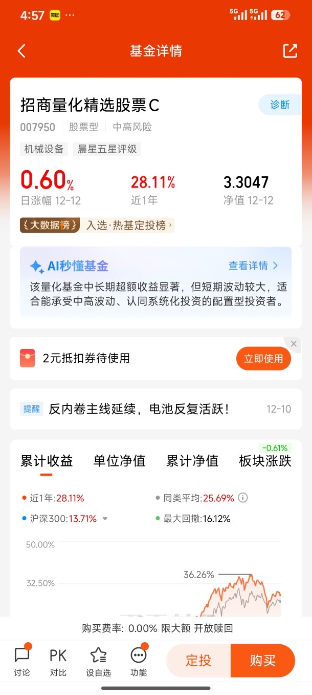 #我的超额日记# ,$招商量化精选股票C$ 的涨势涨到了我的心坎里,也融到了我的行动上,长期持基,没有一只真正的量化基金是不完美的,也是收益不够确定的,只有将资金放在量化基金上,才能摈弃震荡,收益持续攀升。@招商基金
