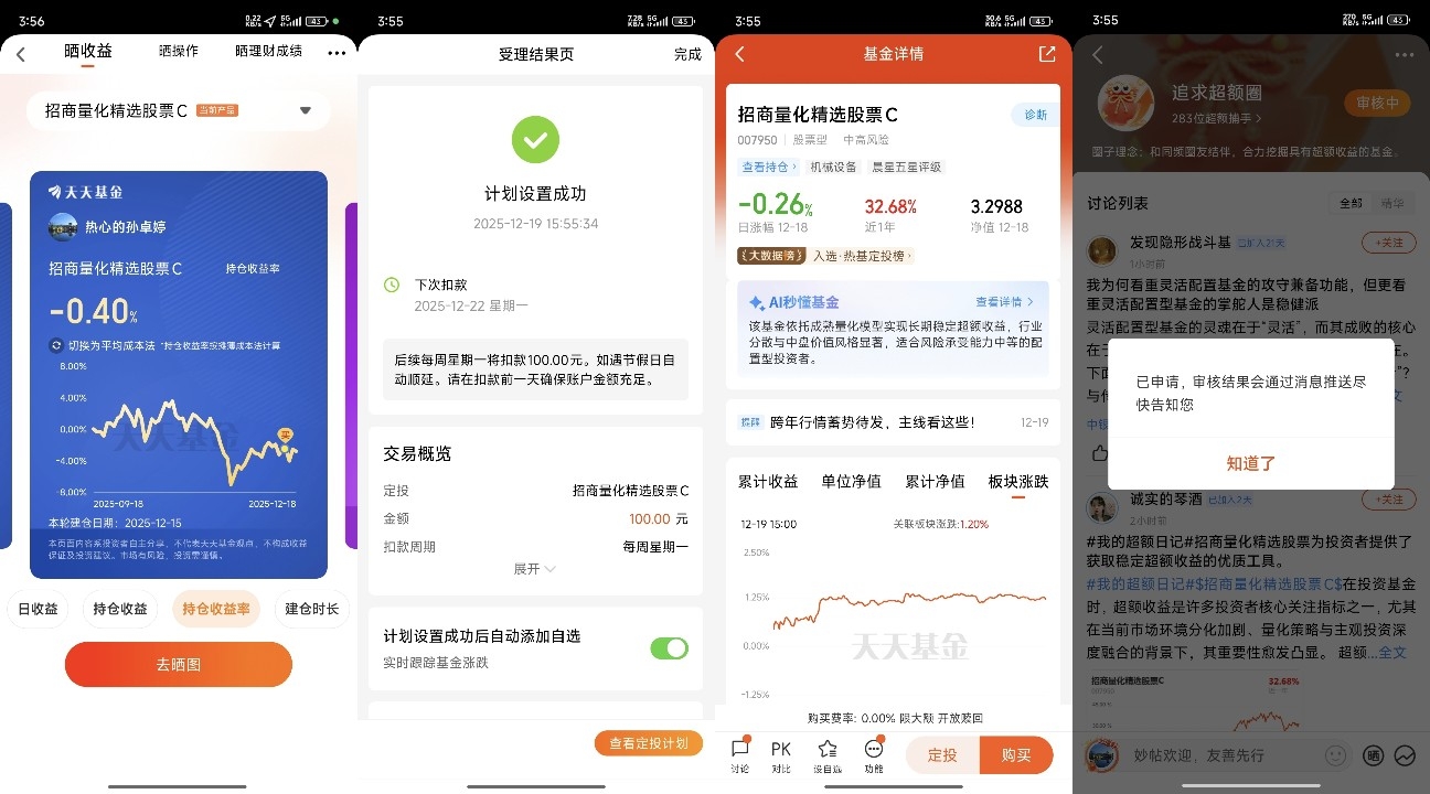 对新员工来说,还有个隐形优势:量化基金的“波动更可预期”。虽然它是中高风险,但分散持仓+纪律性操作,让波动比主动权益基金更平缓。我持有这半个月,最大单日跌幅才0.39%,远没有股票基金那种“一天亏掉半个月工资”的惊吓感。而且通过每周定投,还能自动摊薄持仓成本,比如现在净值回调,我定投的100元能买到更多份额,等后续上涨时,收益也会更可观——这正是“微笑曲线”的魔力,也是新员工对抗市场波动的最佳武器。