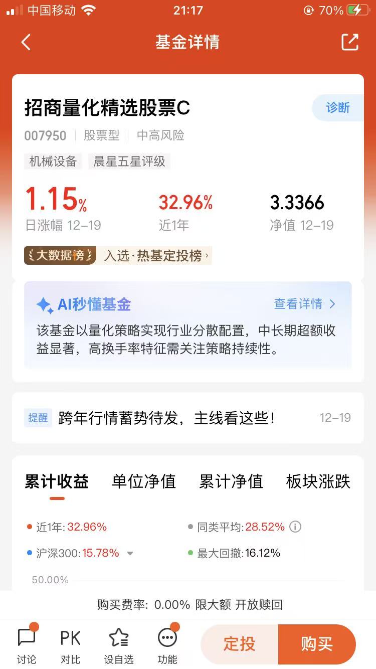 起初我零散关注过几只宽基量化基金,但始终觉得缺少贴合当下市场趋势的细分赛道布局。直到北交所“深改19条”落地,专精特新企业的成长潜力逐渐凸显,我才把目光聚焦到北证50这个赛道。对比多只相关基金后,招商基金旗下的$招商北证50成份指数发起式C(OTCFUND|017518)$,成了我量化布局的最终选择。