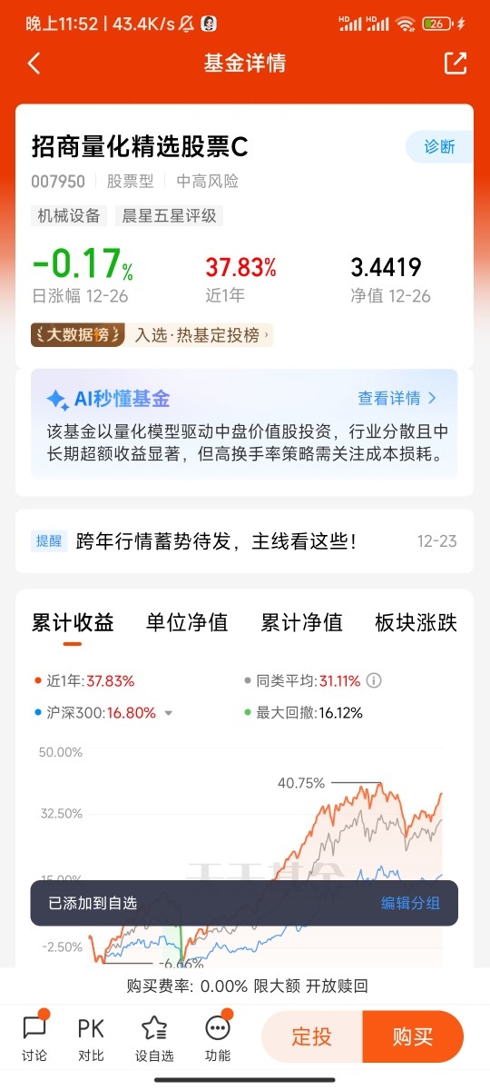 初识这只基金,源于2024年年末的一次“破局尝试”。彼时我手持几只主动权益基金,却被市场的剧烈震荡折磨得心力交瘁——看着净值随热点板块大起大落,忍不住频繁操作,结果反而踏错节奏,收益平平。偶然间看到招商量化精选股票C的业绩榜单,它近一年收益率远超同类平均水平,夏普比率亮眼,更吸引我的是其“多因子量化选股”的核心策略,不靠基金经理的主观判断,而是用数据模型挖掘市场中的价值洼地。抱着试试看的心态,我拿出部分资金买入了这只基金。