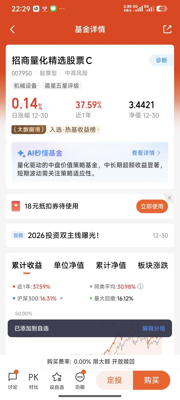 初识这只基金,是去年年末的震荡行情。当时市场风格切换飞快,价值与成长板块来回拉扯,我手里的几只主动基金因为重仓赛道回调,净值波动大得让人揪心。一次偶然的机会,我在基金社区刷到了招商量化精选股票C的业绩曲线,它没有极致的爆发力,却在市场下跌时回撤控制出色,上涨时又能稳稳跟上甚至跑赢指数,这种“涨得多、跌得少”的特质瞬间吸引了我。抱着试一试的心态,我入手了一笔C类份额,没想到这一持,就是一整年。